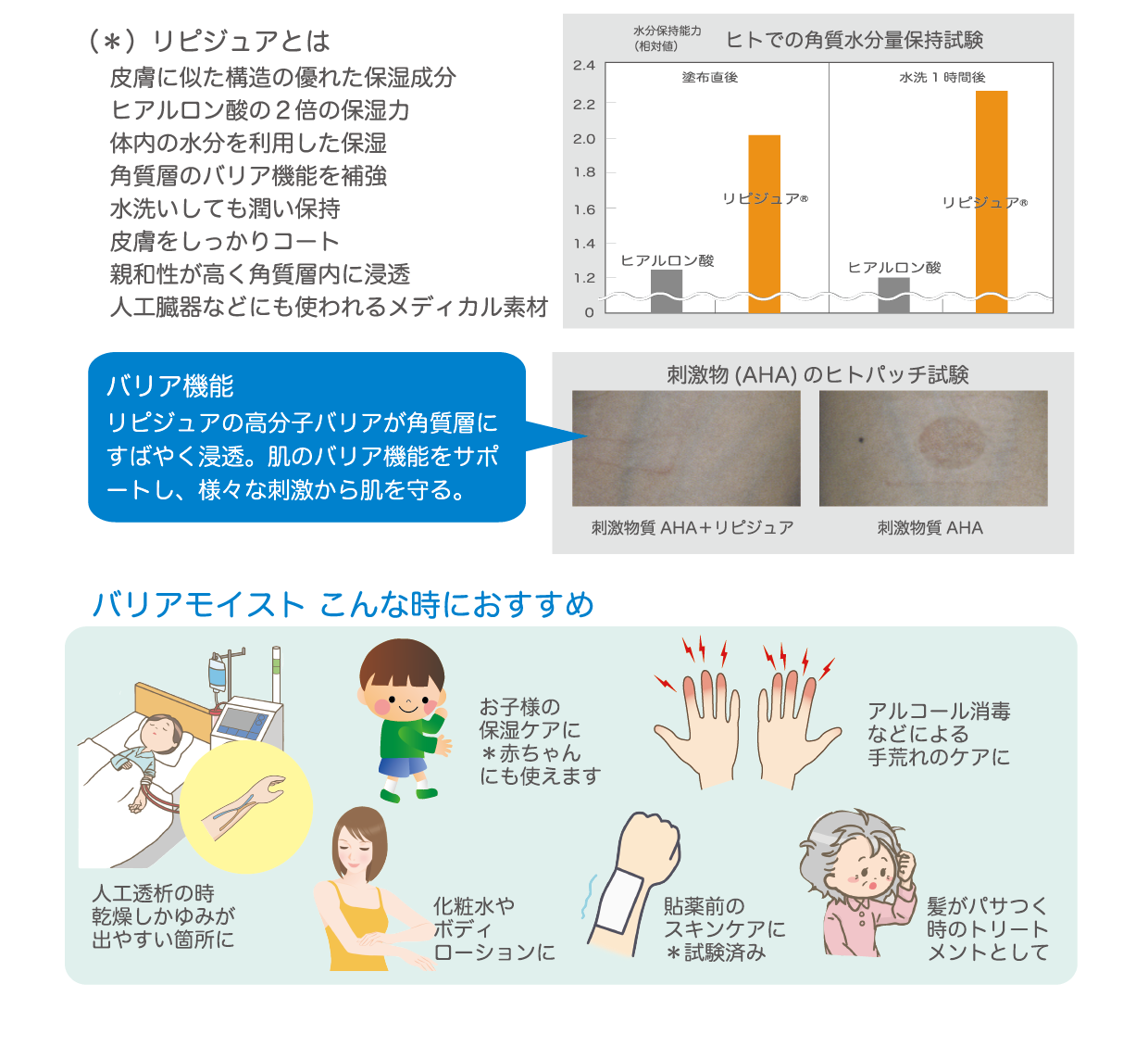 ヒアルロン酸の2倍の保湿力「リピジュア」高配合の高持続型保湿剤 甜菜(てんさい)から抽出した植物性保湿成分を独自配合し保湿力更にアップ! 肌のバリア機能をサポートし、様々な刺激からお肌を守ります。
